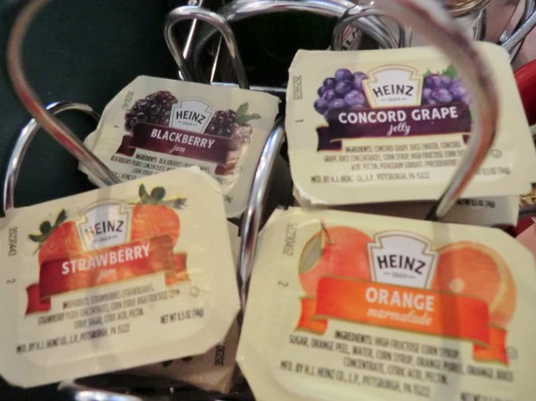 テーブル卓上には朝食に欠かせないシロップ、ケチャップなど代表的なものが揃っています。ジャムは苺、オレンジ、葡萄、ブラックベリーの4種もありました!ホットソースは赤と緑のソース2種もあり。メキシコ風朝食には欠かせないです。
