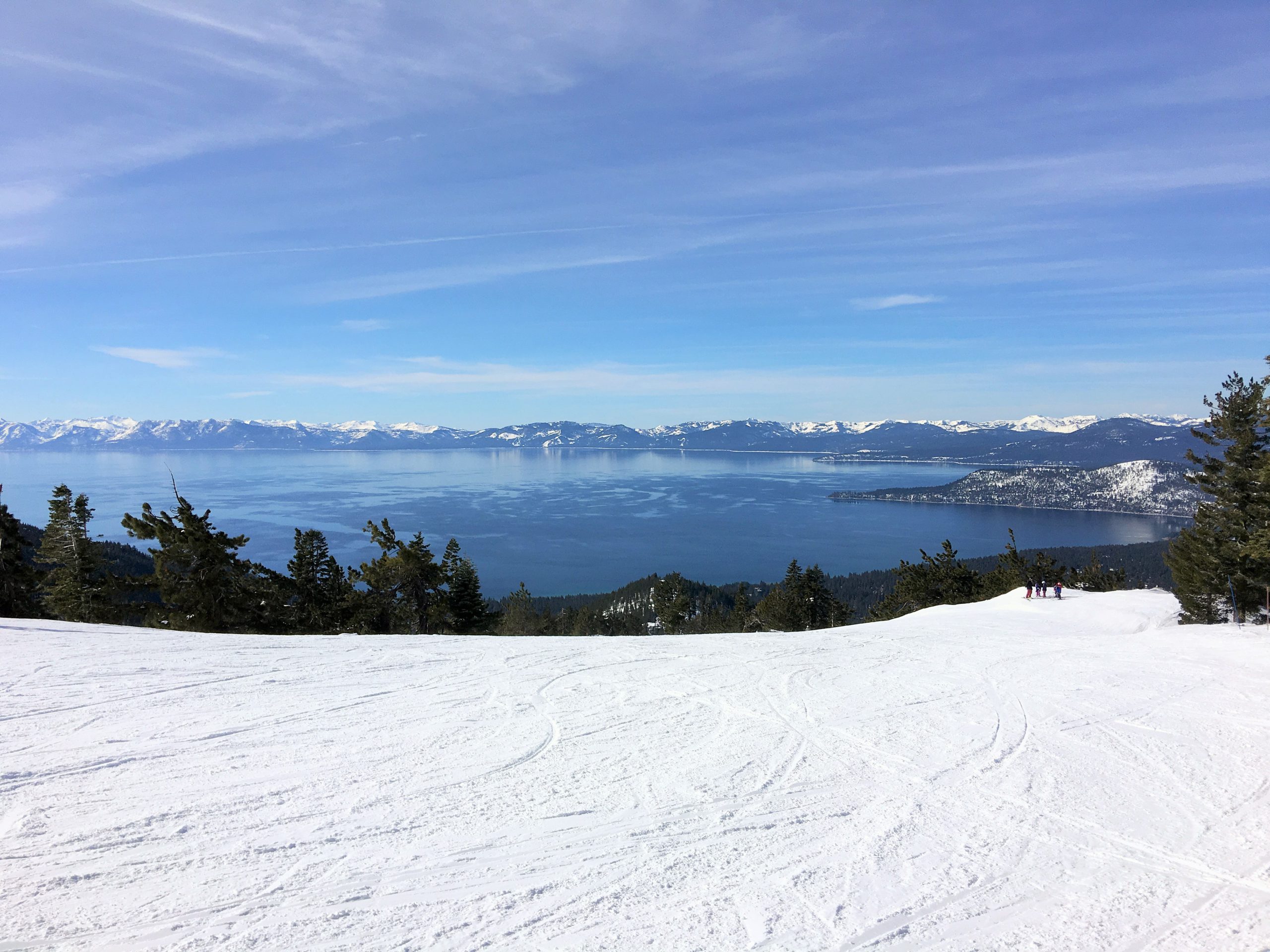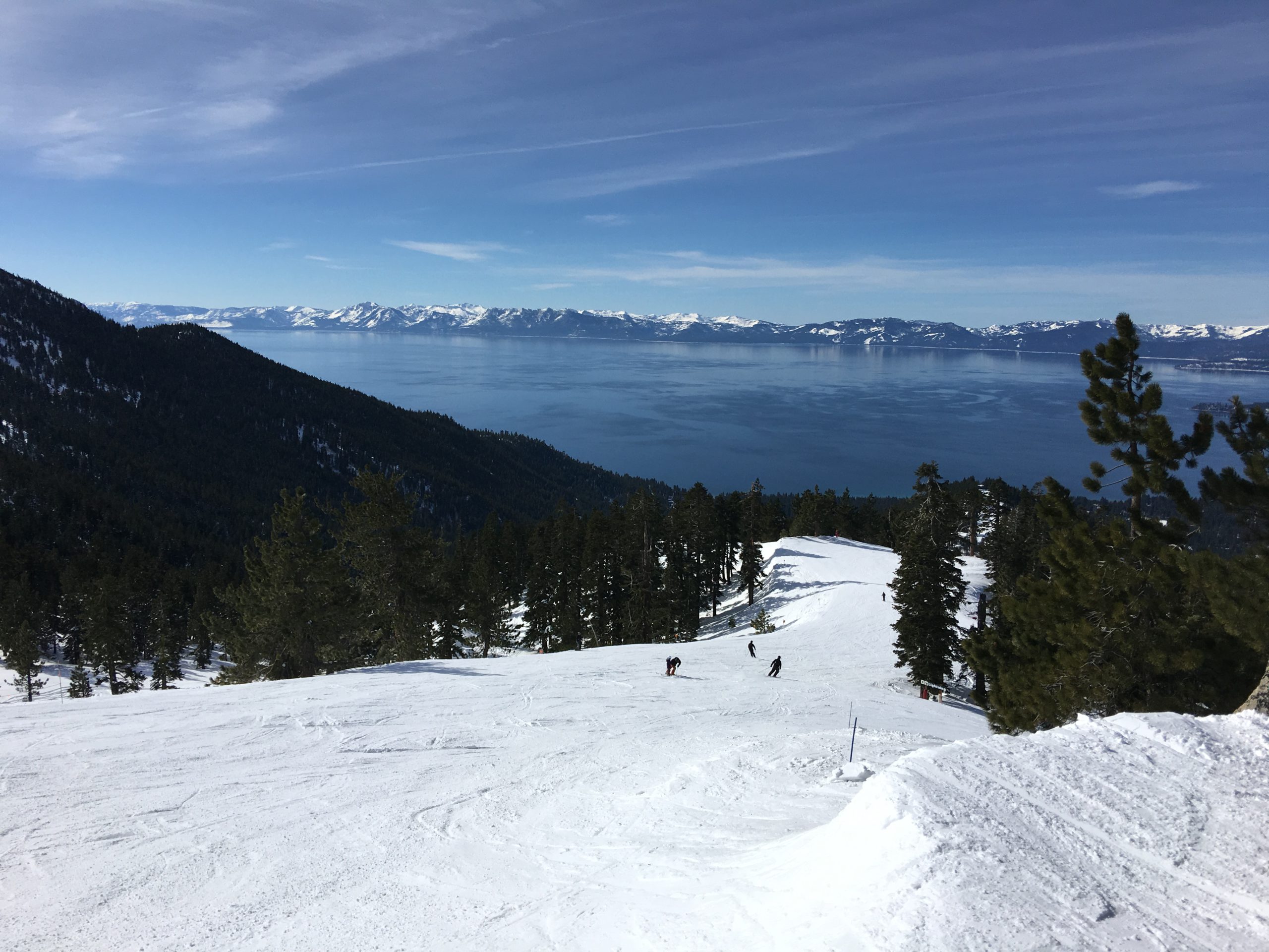 Snowflake Lodgeを出て中級コースのRidge Run~初級コースのFreewayを経てCrystal Expressリフトで山頂へ。さすが山頂、タホ湖ビューはさらに美しさがパワーアップされた息を呑む眺望でしばしうっとりと眺めを堪能。ず~っと眺めていても飽きなかったですが、湖を眺めながらのスキーもしないと!なのでCrystal Ridge方面へ。