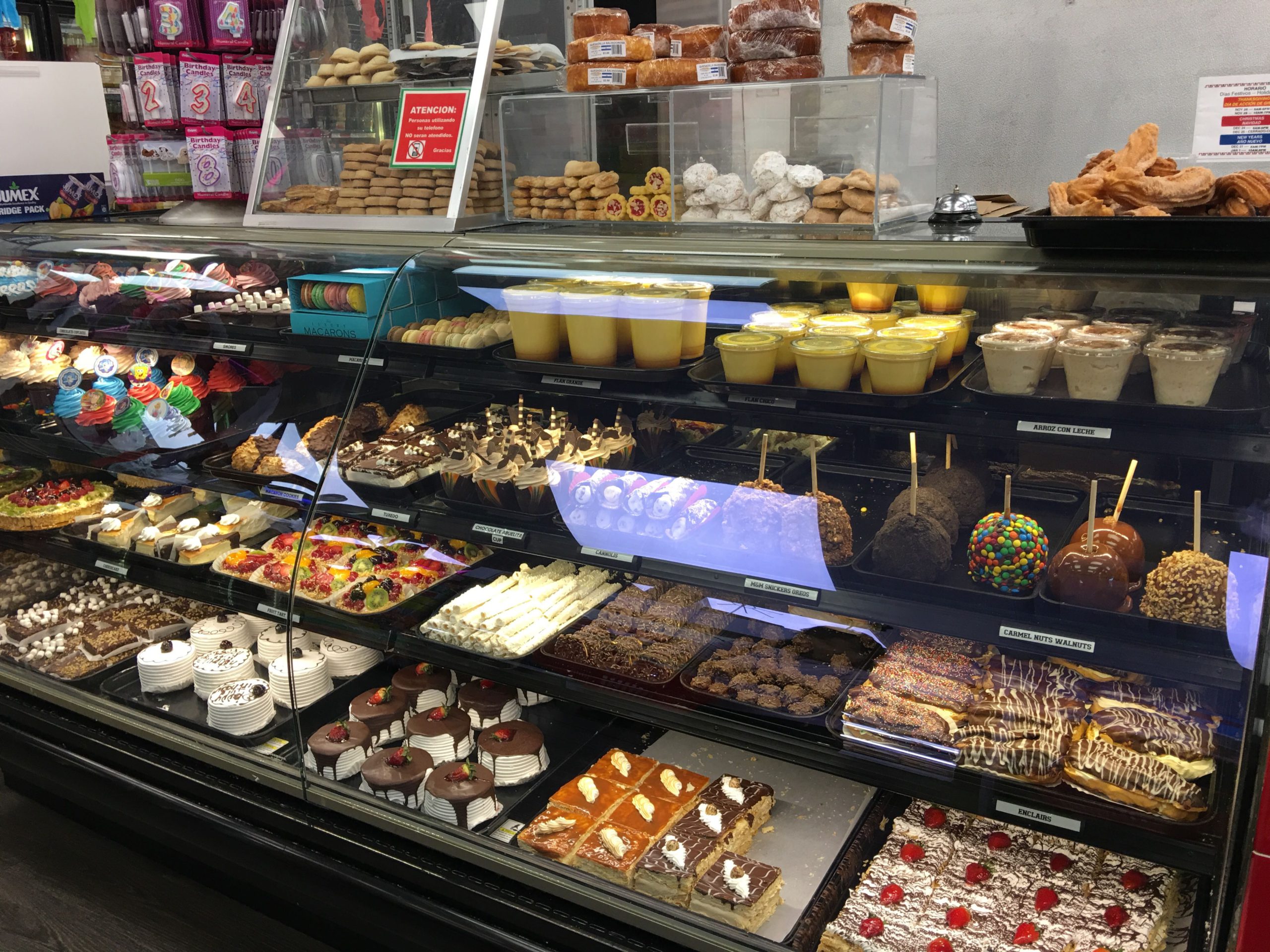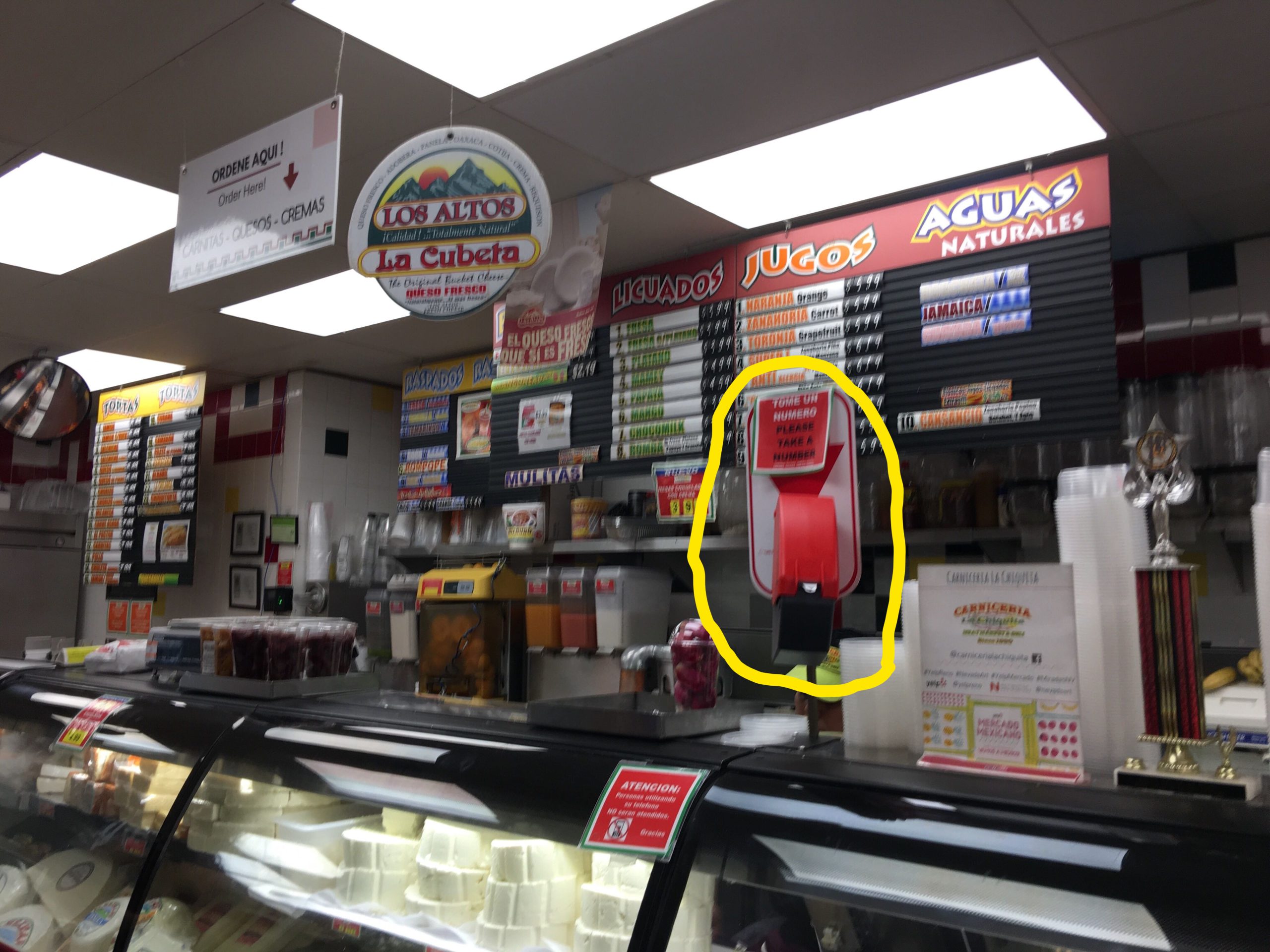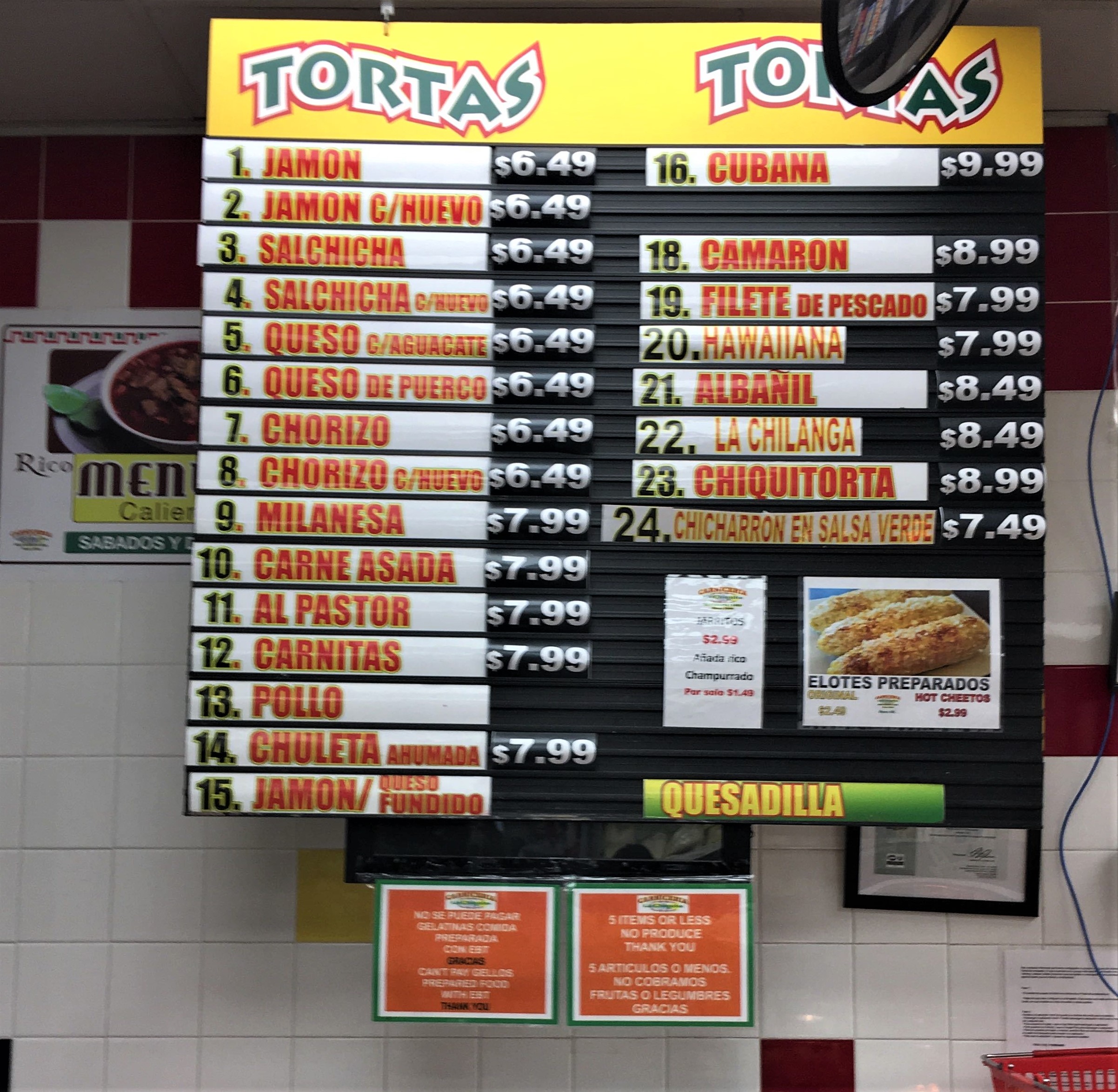 入口入って左はサンドイッチ(TORTAS)・惣菜・スムージーのコーナー。整理券をとり、電光掲示板に自分の番号が表示されたらカウンター左側で注文します。ここで注文したもののみ、ここで支払い、店内の他の食品等は入口入って右横の別のレジで支払うシステムになってます。メニューにあるスペイン語和訳(分かるもののみですみません)こちら↓ご参照下さい。