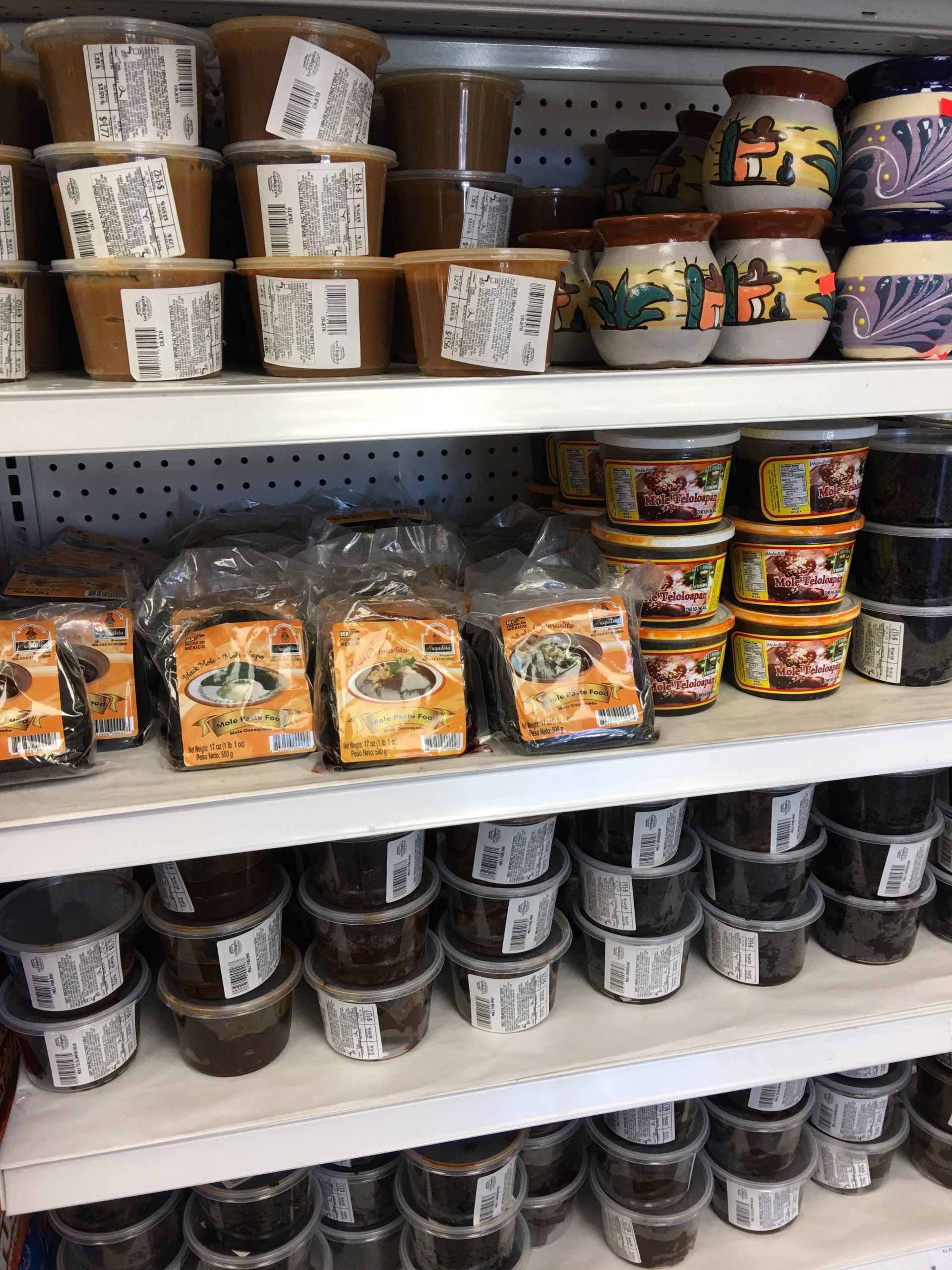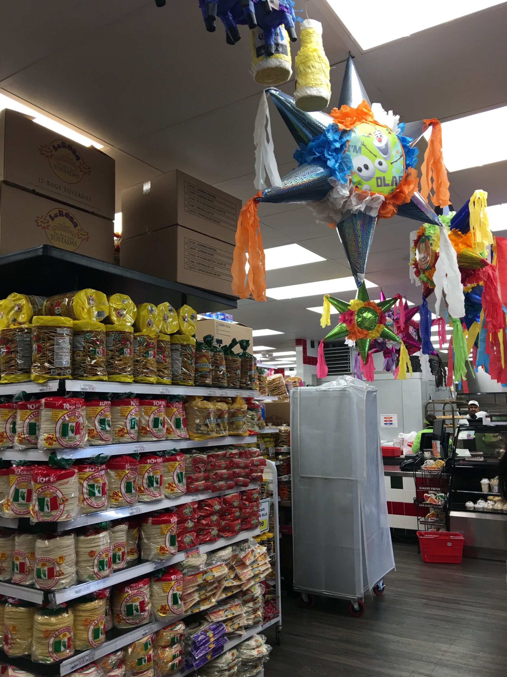 メキシコの子供の誕生日会で欠かせないピニャータ(中にキャンディを詰め、目隠しをしたお誕生日の子供に棒かなんかで割らせ、誕生日会に参加した子供たちでキャンディを拾うというゲーム。日本のスイカ割りとやや似てるかな。)も天井からいっぱい吊るされて販売されてます。タコス、トルティーヤは言うまでもなく、見たことないメキシカンなお菓子やモーレ・ペースト等のメキシカンならではの食材もあります。